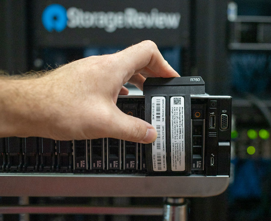 我们的 R760 背面还包括 NVMe BOSS 启动驱动器。 这些可通过嵌入式 RAID 控制器从外部访问。