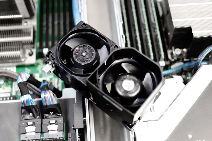 当我们拉动大部分立管和电源时,很容易开始了解气流是如何设计的。前面的六个风扇驱动空气流过 CPU 和 DRAM,然后将其压过电源,冷却两侧的 PCIe 插槽和死点的堆栈。