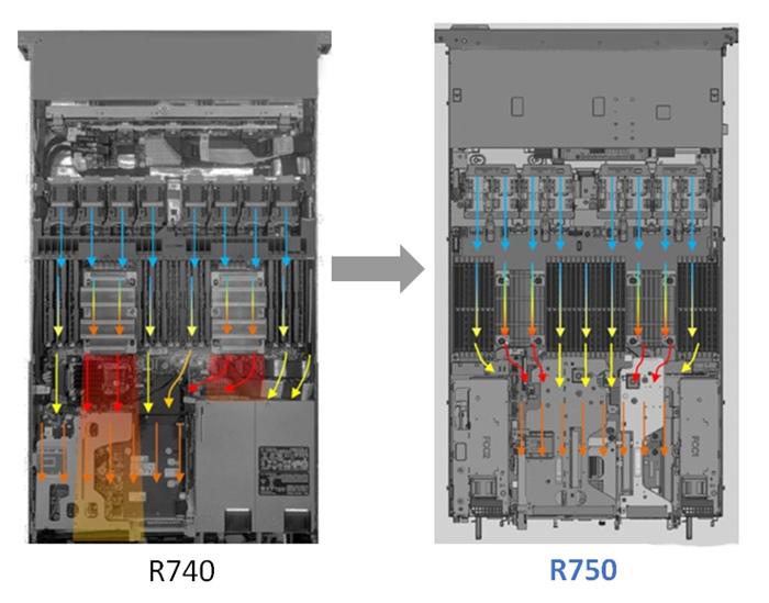 上图显示了 R740 和 R750 之间的气流差异。虽然这些只是渲染图,但很明显可以看到重新组织机箱对热动力学的影响。